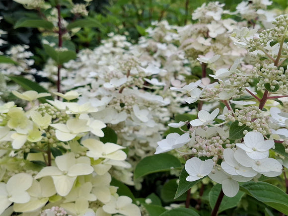 Šluotelinė hortenzija 'Wim's Red' balti žiedai vasarą VII mėn.